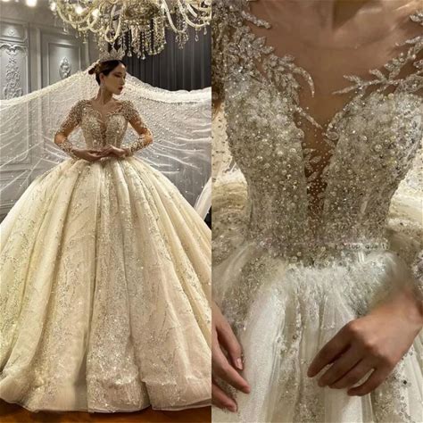 Gorgeous O-Neck Long Sleeve Bride Dress Sequins Beaded Wedding Gown Dubai Sweep Train Bride Robe